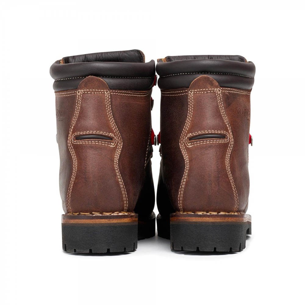 Gronell Stelvio 3 cuciture é l’iconico scarpone dal look vintage costruito con la tradizionale lavorazione “Norvegese” a 3 cuciture; Realizzato in spessa Vacchetta svizzera conciata con ricetta originale “Gallusser Juchtenleder”