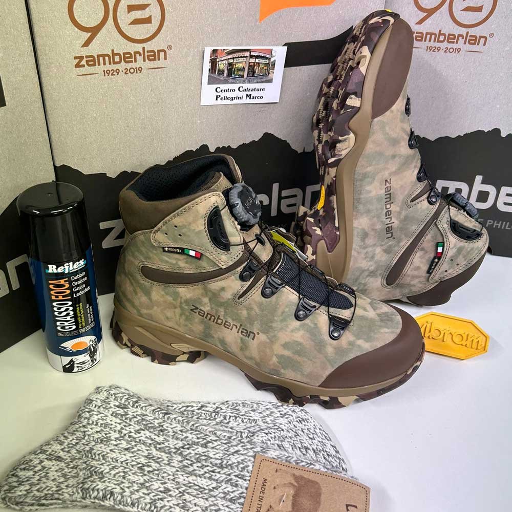 Proprio questo sistema di allacciatura, comodo, resistente e impermeabile, rende 4013 LEOPARD GTX RR BOA un prodotto adatto per tutte le situazioni in cui il cacciatore si trova ad attraversare la boscaglia e macchie di rovi oppure in zone montagnose, nelle quali è preferibile mantenere libere le mani. Per una maggiore flessibilità ed una camminata più agevole, 4013 LEOPARD GTX RR BOA è dotato dello snodo FLEX-SYSTEM e di una rollata pronunciata. L’alta tomaia in Nabuk tinto in botte è realizzata con una peculiare sfumatura camouflage, concessa in esclusiva a Zamberlan®. Qualità garantita Made in Italy.